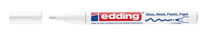 Réaliser des dessins et décorer des surfaces lisses n'a jamais été aussi aisé qu'en utilisant les marqueurs peinture edding. Avec la pointe ogive de 1 à 2 mm d'épaisseur du marqueur, vous pouvez réaliser des inscriptions et des décorations détaillées sur des surfaces en verre, des boules pour sapin de Noël, des boites à biscuits en métal ou des boites de rangement. Son encre opaque est très couvrante et extrêmement durable.