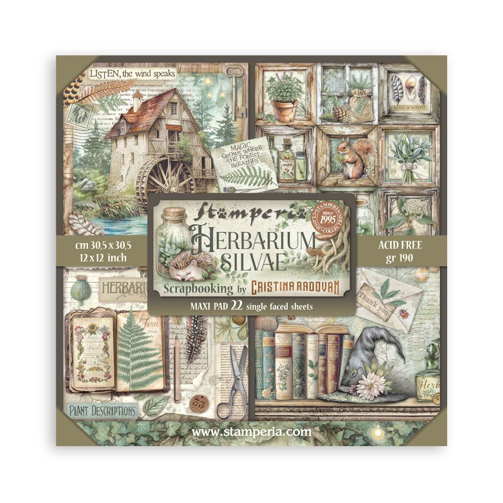 Papier scrapbooking, 30x30cm, Herbarium Silvae - Stamperia - 22 feuilles - motif recto