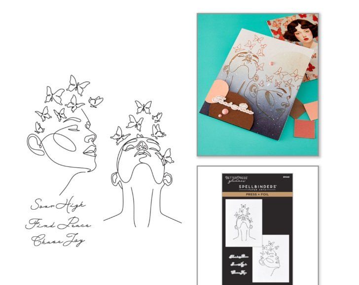Le set Whisper Weave Press + Foil Plate & Die fait partie de la collection All My Senses de Jaycee Gaspar. Ce set comprend cinq plaques et trois matrices de découpe en métal fin. Deux poses sont proposées : l’une de face, l’autre de profil, avec des papillons dans les cheveux. Les trois autres plaques présentent des messages en anglais.